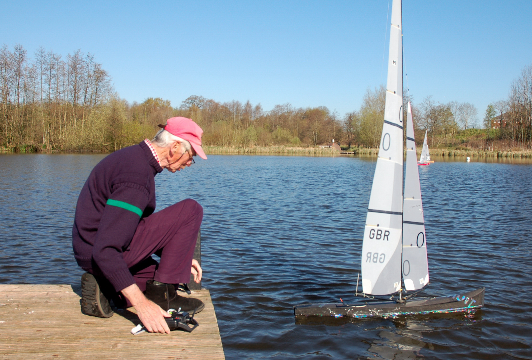 On the 17th April Eastleigh & District Model Boat Club  hosted the 4th Games and Inter Club Marblehead event at the Lakeside Eastleigh on a fantastic spring day,  the sun was shining the birds were singing and 14 hopeful skippers from 5 clubs arrived in time for the 9-45 briefing. The wind was light varying from North East to North with a few holes, but blowing more or less down the length of the lake.  OOD Robert Hobbs and his team of Danny Wilson, Mick Croxson, Robin Ancliffe and Alfred Flitney set a port rounding course of two long triangles.