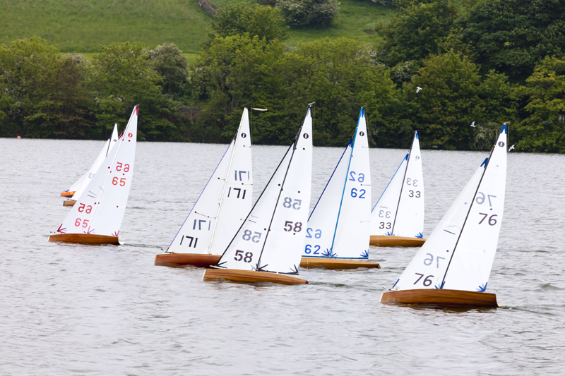 In their second year of sailing, Kinghorn Radio Sailing Club were pleased and honoured to be asked by the Scottish District of the Model Yachting Association to host the Championship affectionately known as “The Woody’s” at their home water, Kinghorn Loch. This venue is a naturally formed “kettle hole” loch approximately 380 metres diameter with an 80 metre south facing pier ideal for radio sailing. Skippers from three corners of Scotland and one from south of the border (Birkenhead) gathered with their beautifully hand-crafted International One Metre (IOM) wooden yachts to race for the championship quaich. With fourteen yachts the obvious choice for the race officer was a single fleet and after a 15minute delay for an electrical fault with David Stewart’s transmitter the first race started at 10.15hrs. The racing conditions were overcast and cold, with a 6 to 8 mph east wind which was ideal for both venue and the largest #1 rigs.