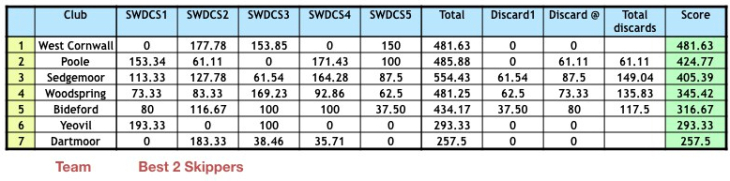 West Cornwall was this years Champion club allowing for 2 discards on the 5 events