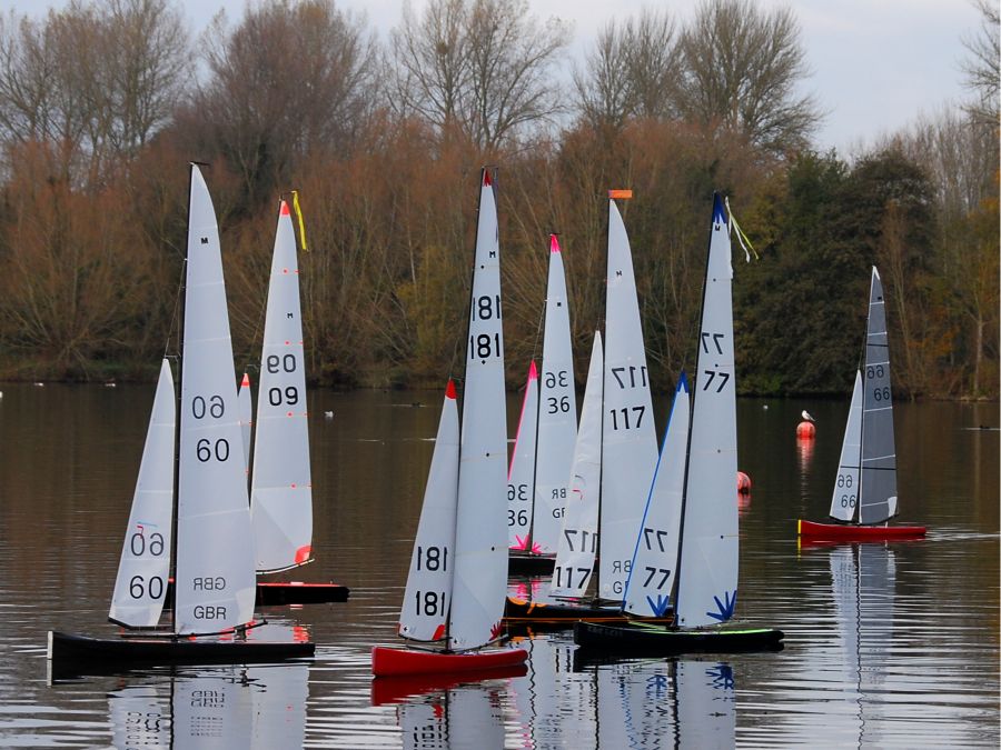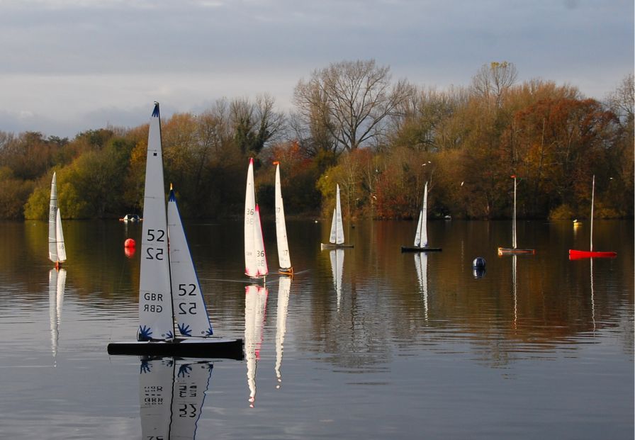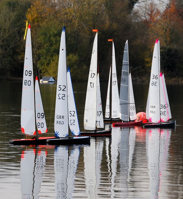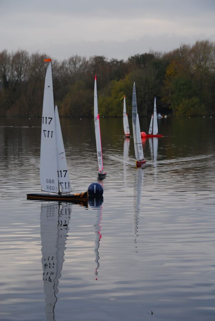 This Marblehead open event is the penultimate event of the GAMES series and attracted 10 entries from 3 clubs. Upon arrival there appeared to be no wind at all and when a boat was launched it took what seemed like forever to get to the nearest mark and back. Race Officer Peter Popham delayed the start of racing by half an hour, by which time there was the faintest of air movement in varying directions. The RO set a short triangular course to take into account this variation and set two laps. Those who had practised and had got their sail settings to work gradually pulled away in Race 1 from the rest to such an extent that Roger Stollery’s UP, Phil Holliday’s GRUNGE and Martin Crysell’s PRIME NUMBER had lapped several back markers before finishing!