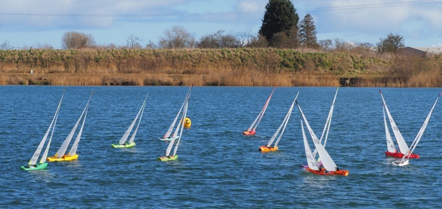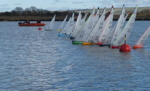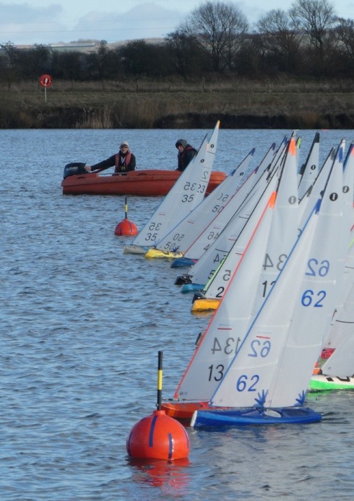 A high calibre fleet passed compliance checks and by Saturday race day, the three heats were ready for the off. Sadly the wind had other ideas, and the AP flag was deployed to allow the wind to build and settle after the initial Westerly breeze died. After some considerable changes to the course, racing got under way approximately 45 minutes late in a light shifty breeze that was clearly still being thermally driven – the North Sea coastline 5 miles to the east was 5 degrees warmer than at the lake and the predicted NE air steam apparently didn’t fancy coming to join us! The wind did eventually start to move right as the land warmed in the sunshine initially to the NW before breeze finally made it past north requiring further course changes and racing restarted in a freshening NNE which continued to move right, at times with a considerable component of East in the mix. The 2 recovery boats were kept constantly busy with mark adjustments throughout most of the day but RO Derek P managed to get 6 completed races in just before navigation lights were needed and that was with a half hour lunch break included as well.