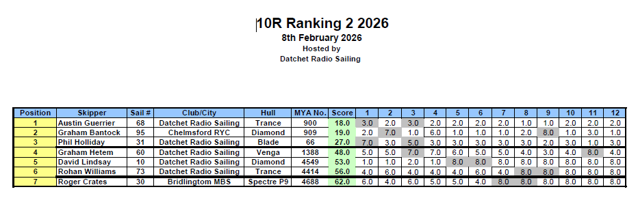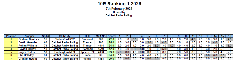 Rain and cool weather, with 5-10mph breezes, greeted seven competitors to Datchet’s north course for the UK Ten Rater Class Ranking events 1&2 of 2026.