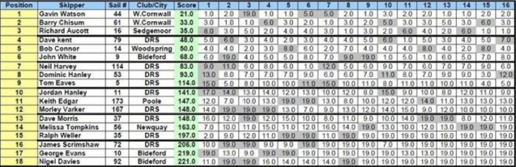 Eighteen competitors took part, all in one fleet. Everyone started in 2nd suit and the majority stayed with that choice throughout the day even though the wind and gusts increased.