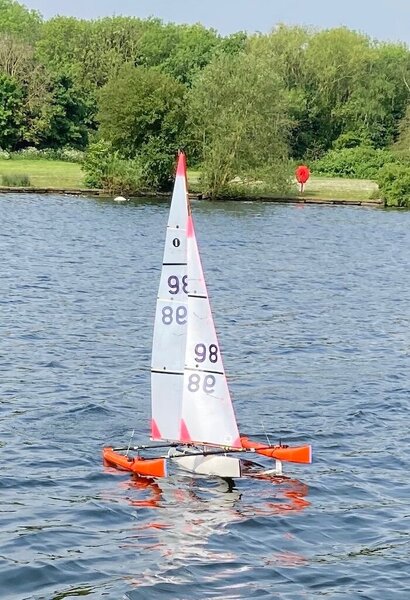 Hi Eric, This is an old One Metre development hull. An extreme design idea that never really worked. Any One Metre would be good though. With the displacement reduced to sub 2Kg a typical IOM will only be on about half of it's WL and "sitting on it's rocker" hence a manoeuvrable platform as opposed to a full WL. Added bonus of plenty of reserve buoyancy. I am printing the floats and also the X beam brackets and foil / rudder incidence adjusting clamps. Not a lot of wind is required to foil, as proven with the same foils on a heavier cat configuration. Light wind - remove foils and slot a short, stub fin to act as a centreboard. Fit smaller rudder and sail conventionally. No ballast required = very nippy ! Don't forget that only one float is in the water at any time with a low wetted area. As pictured with the orange prototype floats, the foils are in the fixed incidence tubes and it was apparent that the high aspect rig moment cancelled the incidence. Next sail will see them fitted in the adjustable, outboard, brackets visible in the shoreside pic. Incidence can be quickly adjusted. The rudder is already mounted in the same bracket on the aft beam. I have a rescue tug (cheaply made from liteply) and will also fit a floater at the masthead to prevent full inversion. Sailing at Colwick Park, Nottingham. US One Metre still available and have pinched the rig for the trip. Might give it a go again.