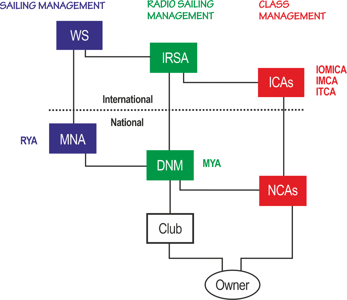 The "basic" structure is a touch more complex. The MYA wears two hats. When it acts as a class association, it affiliates to the class ICA, if any. When it acts as the national authority for radio sailing, it affiliates both to IRSA as the DNM and to the RYA (the UK MNA) for sailing under the RRS. Interestingly, an owner has three affiliations in principle (though they might not know that explicitly) -- to their club, to the MYA, and to the class association of the boat they sail.