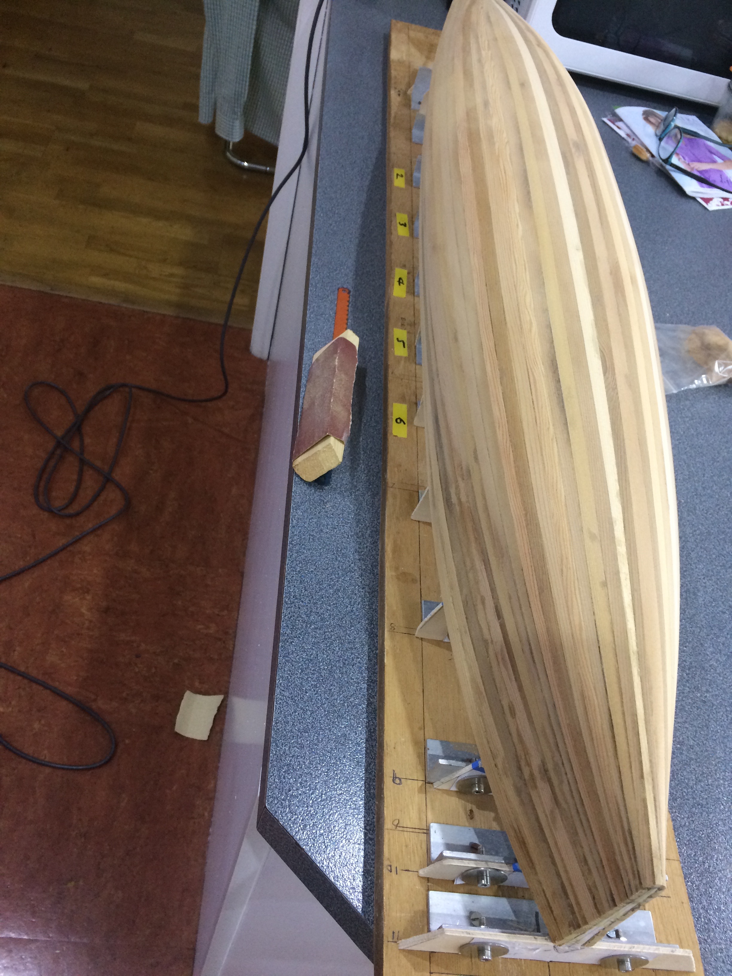 November 2, 20196 yr Author Hello Howard. I am not a scale modeller but I do know that the approach needs to be different. Weight and strength makes it much more of an engineering task. For this reason I make all the planks full length with no "closing" planks just my way, but it means that each tensioned plank contributes to the stiffness. This will result in an odd looking plank line and not like a model. I use cedar planks; 10 X 3mm. I precut only 3 different shaped planks with a parallel in the centre tapering to the ends with the parallel part reducing in each of the batches of 3. I have one of those little razor planes and it is perfect for tapering the planks a pair at a time. Each plank only requires edge sanding to fit snugly to its neighbour. I usually do the layup 3 planks at a time on each side, leave for a few hours and do the next 3. Really quick and I find the hull the quickest part of making a One Metre. Cedar versus Balsa ! I don't want to start a debate, since each builder has a preference. I prefer Cedar. It is much more tolerant to being pulled down hard whereas you cannot do this with balsa because it bends too easily and it difficult to avoid dips between the frames and you cannot tension balsa at all. It is the tension locked up in the tortured cedar planks that results in considerable strength. The bare hull shell should "ring" like a violin. Glue is important here and you need a quick grab aliphatic resin. It is vital that any excess glue is wiped off immediately, it swiftly adds to unnecessary weight. I use Deluxe Aliphatic resin; available from model shops. Also about ten rolls of 10mm insulation tape. Balsa also hoovers up resin when coated. I coat the whole shell with SP106, light and very strong epoxy. The same I use for filleting and all bonding. Although I do not always glass a hull, I did line the inside of Alternative because it is quite a tight shape. Only the inside though and I use very fine woven glass: about 50gsm. That is what I do, Howard. I am sure that you will get a different approach from whoever you ask though. Each just as good for them. Building a modern boat like Alternative is a huge saving on a purchased hull and I can assure you that this design, carefully built will see you at the front of the fleet. Richard
