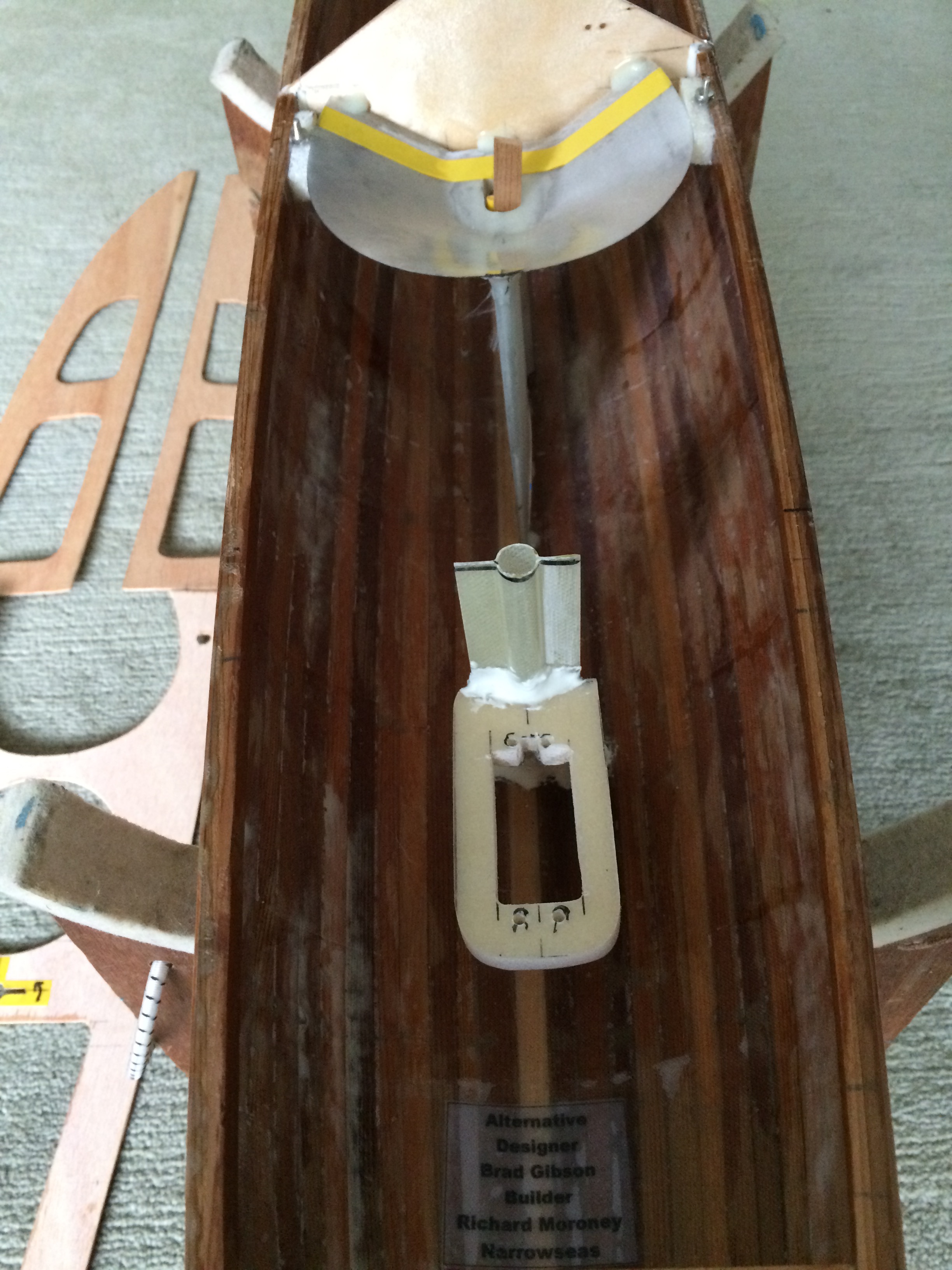 April 18, 20187 yr Hi Richard, I've just finished building my Alternative and I am in the process of rigging it. I have used a planked balsa wood contruction sheathed both sides in fibre glass mat using light weight epoxy resin. Weight of painted hull with winch, servo,pot, battery and receiver is 855 gm's. I wanted a total weight under 4 Kg. In a test tank the boat floats perfectly on her waterline. I am having a problem fitting a mast ram at the moment, there isn't enough room between the bulkhead and the mast. I have attached 3 photos but the resolution is greatly reduced in order to send them. Roger