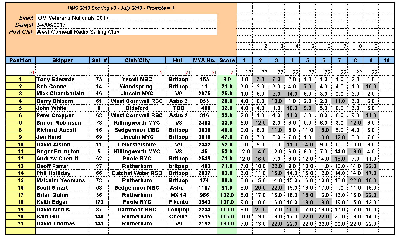 IOM Veteran Nationals Day 1 Results03/06/2017IOM, Racing ReportsSome news and scores from the first day of the IOM Veteran Nationals. The IOM Class captain reported “Good day today, with three rig changes, nine races and no protests. Wind looks better for tomorrow”Share This Twitter Facebook Email MYA UKTwitterFacebookRelated PostsIOM Scottish District Notice of Race2026 MYA Scottish District IOM Wooden Hull Championship, Greenock, Saturday 2nd May – NOR and Entry FormThe 2026 MYA Scottish District IOM Wooden Hull Championship will…14/04/2026Eastern District IOM Notice of RaceNotice of Race – Thames Trophy IOM Open – 10th May 2026Coalhouse Fort RYC are please to announce entry is open…10/04/2026Eastern District IOM Racing ReportsEastern District Champion Skipper – Round 2 at Huntingdon RYC on 26 MarchA cold but steady breeze greeted the 25 competitors who…29/03/2026Scottish District Dragon Flight 95 Racing Reports2026 MYA Scottish District DF95 Championship, 21 March 2026, hosted by Ayr Bay RYCAyr Bay Radio Yacht Club hosted the first major event…23/03/2026