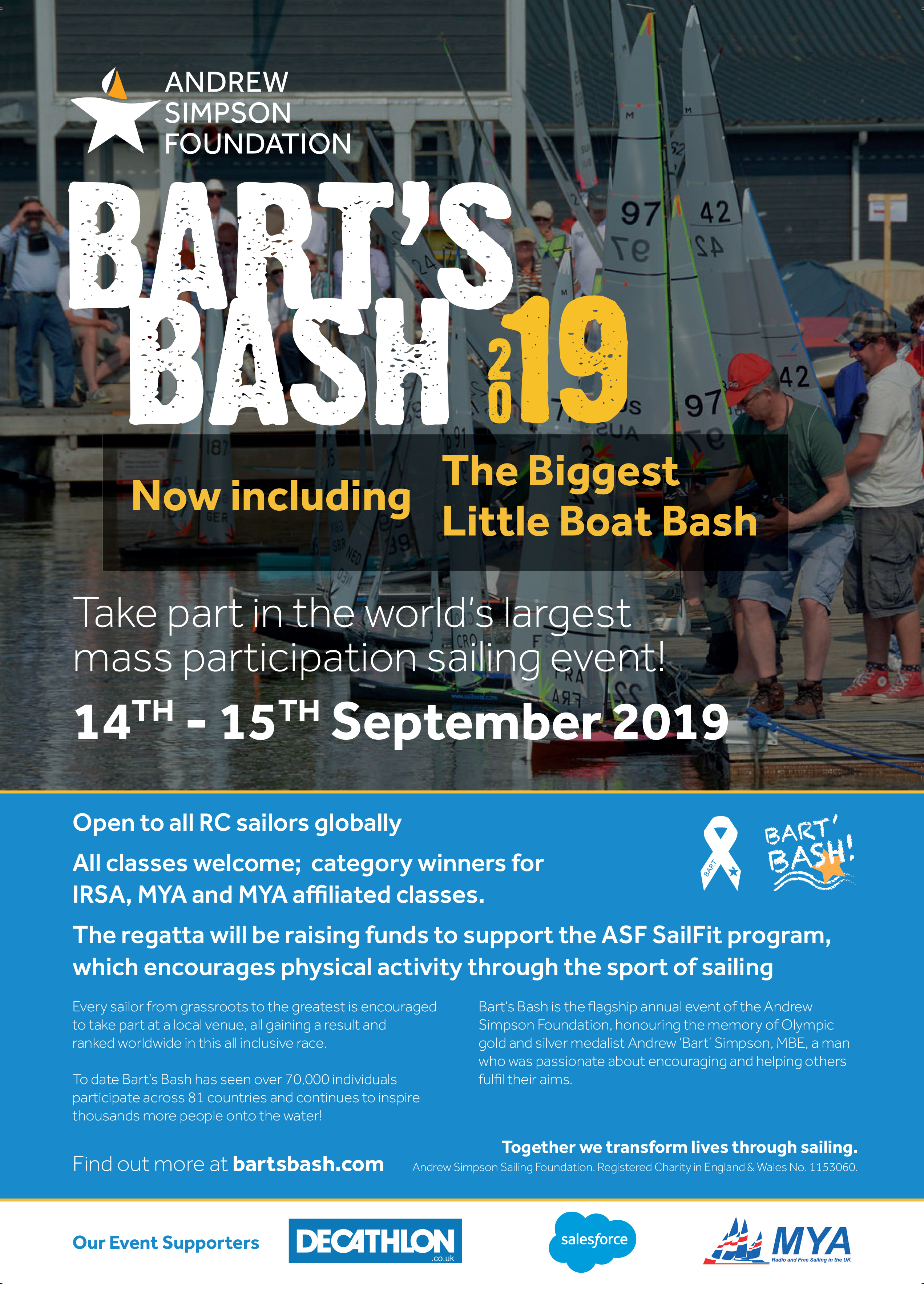 The aim is to get 3 races completed and each sailor counts their fastest race. All the data is then collected by the clubs and sent to the Andrew Simpson Foundation who will calculate an overall result sheet for every RC sailor who has entered. From this there will be an overall winner for each IRSA, MYA and MYA affiliated class, and although this event is about charity and participation the winning skipper from each category will have their name published on the Bart’s Bash and MYA website as recognition.