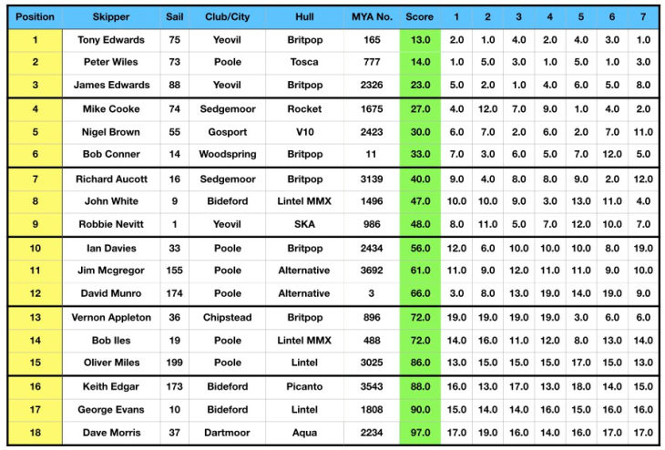 18 skippers turned up for this event including 2 from outside the South West District, Nigel Brown from Gosport & Vernon Appleton from Chipstead.